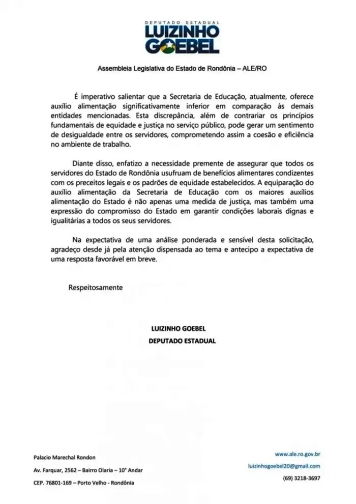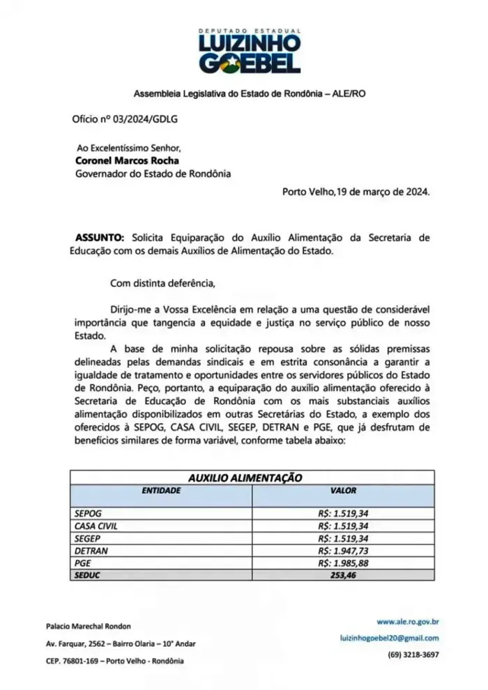 Em ofício encaminhado nesta sexta-feira, 19, ao governador de Rondônia, Marcos Rocha (UB), o deputado estadual Luizinho Goebel (Podemos), solicita o aumento do auxílio alimentação dos servidores da Seduc, equiparando aos dos funcionários do Detran ( R$ 1.947, 43), Casa Civil (R$ 1.519,34) Sepog (R$ 1.519,43), Segep (R$ 1.519,43) e PGE (R$ 1.985,88). Luizinho Goebel é o presidente da Comissão de Educação e Cultura da Assembleia Legislativa de Rondônia.