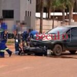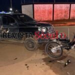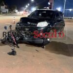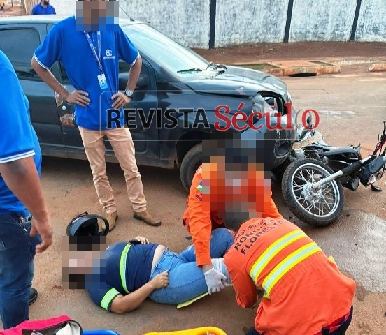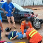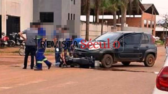 Motociclista fica ferida após colisão entre carro e moto no cruzamento da Avenida Rondônia com a Rua Ceará, em Vilhena
