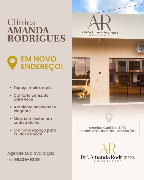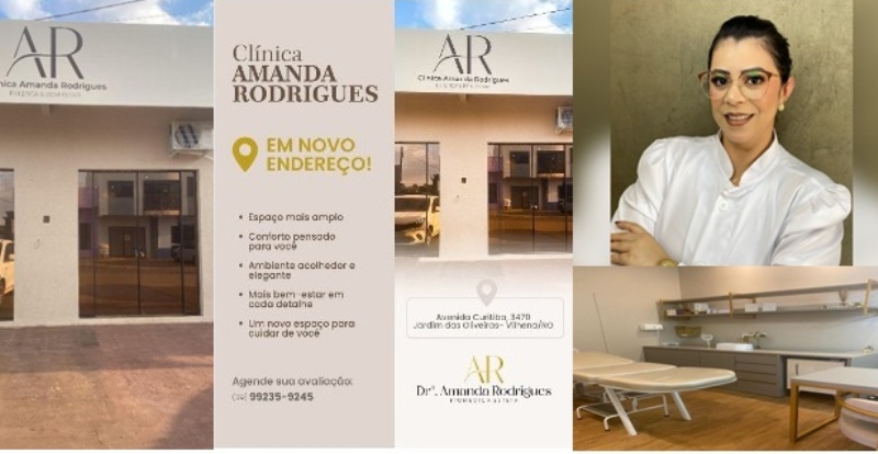 A biomédica esteta Dra. Amanda Rodrigues, popularmente conhecida como “Amanda das sobrancelhas”, anunciou oficialmente a mudança de endereço de sua clínica, agora instalada em um espaço mais amplo e moderno na Avenida Curitiba, nº 3470, no bairro Jardim das Oliveiras, em Vilhena (RO).