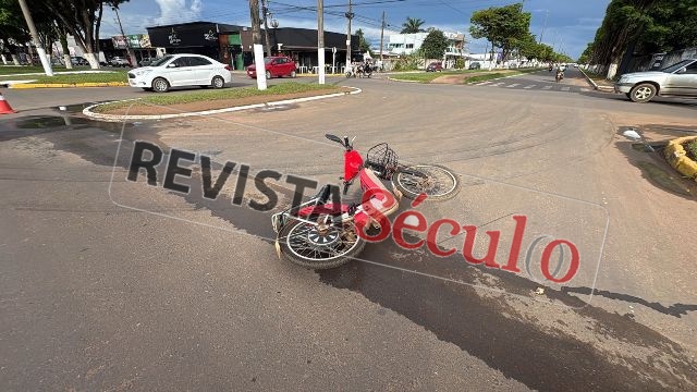 Bicicleta elétrica e carro de passeio colidem em cruzamento e mulher fica ferida em Vilhena