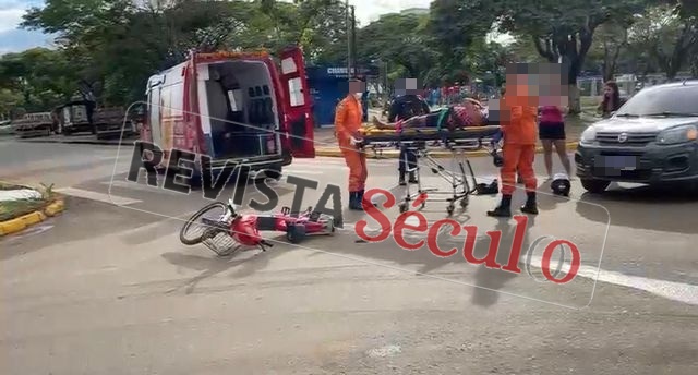 A ciclista já realizava a rotatória do cruzamento quando ocorreu o impacto. Com a colisão, ela sofreu ferimentos e precisou de atendimento imediato.