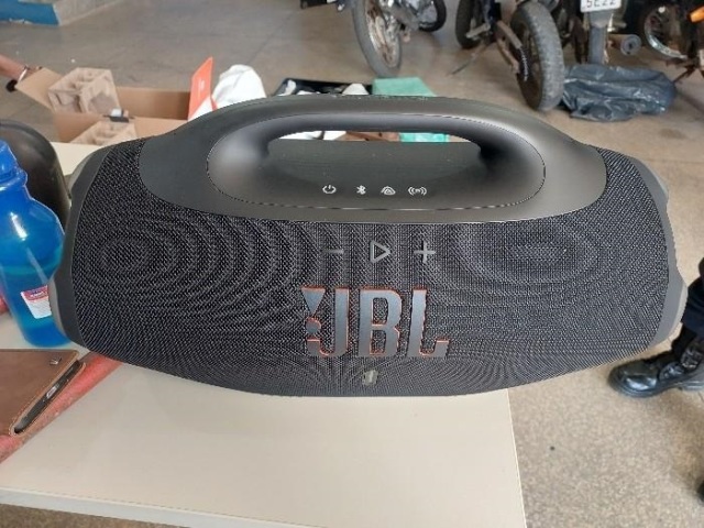 Durante a averiguação no apartamento do menor, foram localizadas e apreendidas duas caixas de som JBL Boombox 4, sendo uma preta e outra camuflada, além de um controle LED remoto GM 1006RS, um alicate tipo tesoura para corte de vergalhão, quatro relógios de pulso de diversas marcas, um pé de cabra e um aparelho celular preto da marca CAT.
