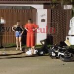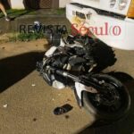 Após cair, a motocicleta ainda atingiu um caminhão que estava estacionado nas proximidades. Apesar do impacto, o condutor sofreu apenas escoriações leves.